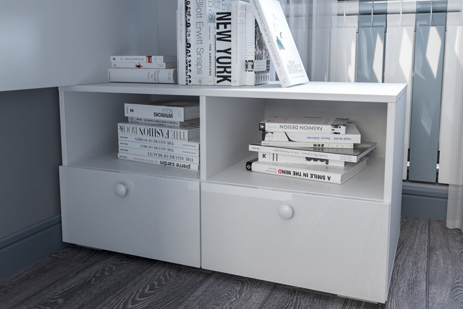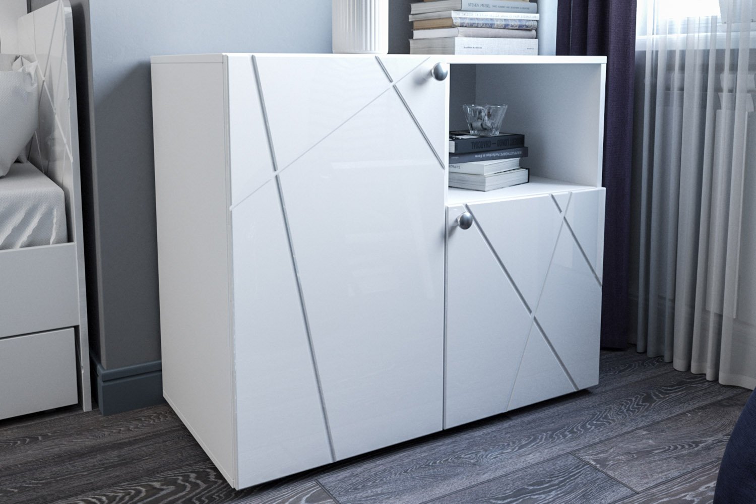 Производится из ЛДСП/МДФ. Цвет мебели белый с глянцем, фасады с фрезеровкой. . Петли дверей без доводчиков BOYARD. Ящики на роликовых направляющих без доводчиков. Ручки "кнопки" пластиковые.