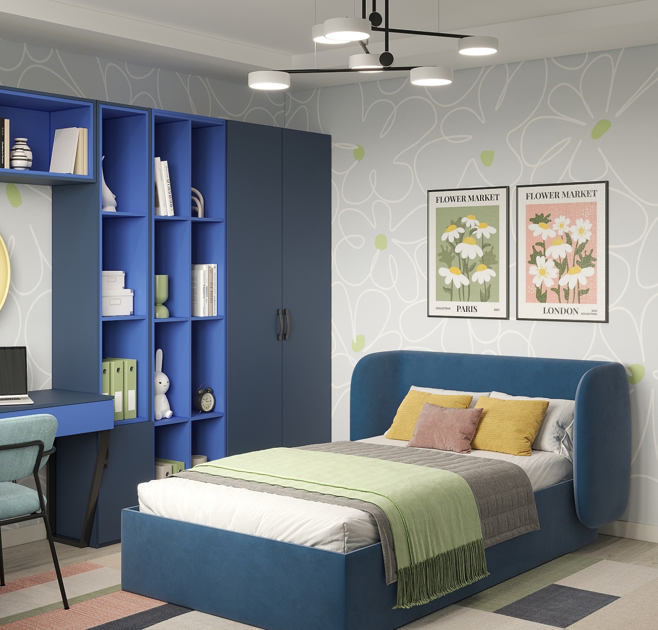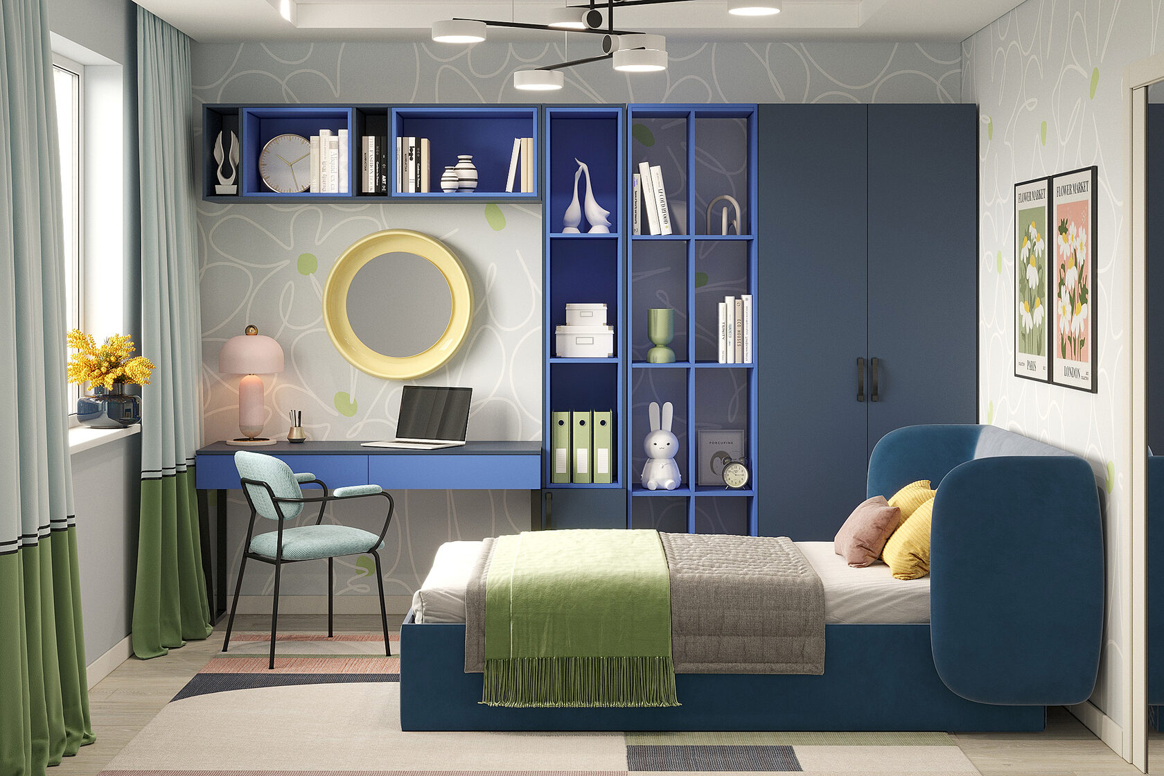 Удивительно-новый цвет: Альби полуночно-синий может быть использован как для девочки-подростка, так и для мальчика-подростка. Лазурные вставки облегчают темный цвет. Петли дверей с доводчиками BOYARD. Ящики - роликовые направляющие без доводчиков. Кровать в мягкой обивке - ткань велюр.