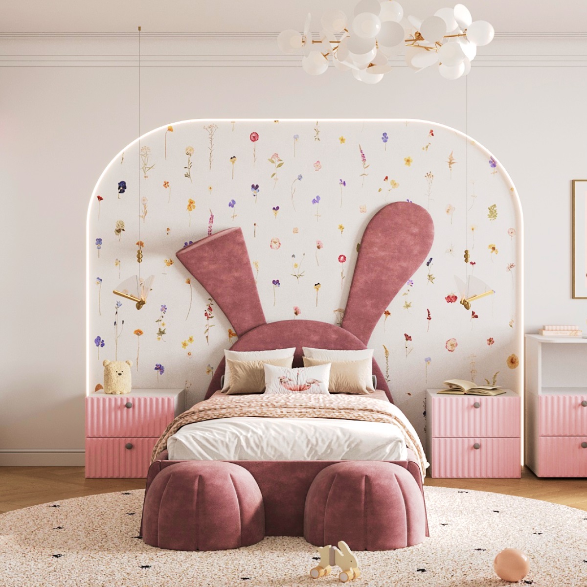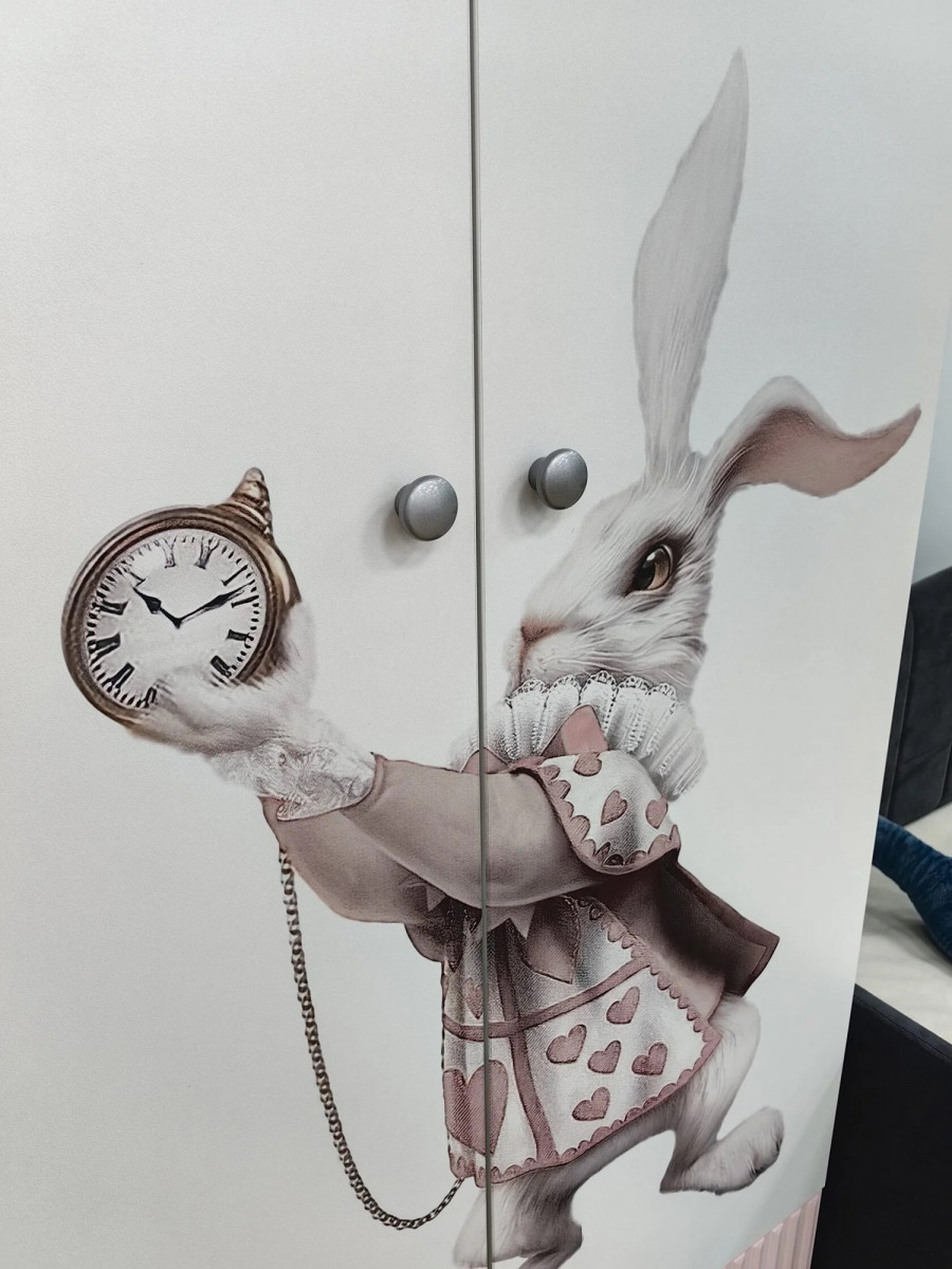 Детская мебель "АЛИСА" представлена в сказочном стиле из сказки "АЛИСА", как ЗАЗЕРКАЛЬЕ. Оригинальная мягкая кровать "зайчик" станет визитной карточкой спальни вашего ребенка. Мебель производится из ЛДСП/МДФ. Цвет мебели белый глянец и присутствуют вставки с фрезеровкой в розовом цвете. Петли дверей с доводчиками BOYARD. Ящики на роликовых направляющих без доводчиков. Ручки "кнопки" пластиковые.